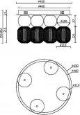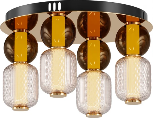 Материал арматуры - металл, цвета - золото, хром. Микс плафонов: гладкие cферы коньячного или дымчатого оттенка + округлые рельефные с ромбовидным узором из прозрачного стекла. Регулируемая высота подвесных моделей - максимальная длина провода 3 метра. LED-источник света, цветовая температура 3000К