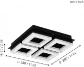 Потолочный светильник прямоугольный светодиодный Eglo Fradelo 1 99326 от австрийского производителя Eglo исполнен в черном цвете из металла. Модель имеет 4 рассеивателя из пластика и подходит для размещения на потолке в гостиной, прихожей и коридоре, спальне в стиле модерн. Лампочки с цоколем 4xLED обладают мощностью 16W, цветовой температурой 3000К с теплым белым свечением и освещают площадь до 3 кв. м. Световой поток 1600 лм. Питание от сети 220V. Монтаж производится на пластину. Длина — 280 мм, ширина — 280 мм, высота — 60 мм. Заказывайте Eglo 99326 онлайн по низкой цене с гибкими условиями доставки на Fedomo.ru!