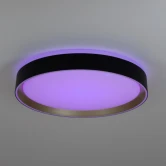 Светодиодный потолочный светильник Citilux BOSS CL751351G с яркой цветной RGB подсветкой всего плафона. Основание металлическое, корпус из чёрного полимера с декоративным элементом в цвете матовое золото. Благодаря оригинальной конструкции, круглый светильник равномерно освещает помещение и дополнительно подсвечивает потолок, что придаёт пространству дополнительный объём. Мощность изделия 48Вт, световой поток 4100Лм. С помощью пульта дистанционного управления вы сможете плавно регулировать яркость 10% - 100%, менять цветовую температуру в диапазоне 3000K - 5500K, что позволяет настроить любые оттенки теплого, нейтрального или холодного света. Цветная подсветка RGB имеет несколько режимов работы, погружая ваше пространство в яркие и насыщенные тона. Функция таймера - отсроченного выключения и 4 настраиваемых режима памяти позволяют управлять светильником максимально комфортно. Накладной светильник подходит для всех видов потолков, в том числе натяжных. Тип крепления – через основание. Изделие комплектуется инфракрасным пультом ДУ. Для питания пульта применяются 2 батарейки формата ААА, напряжением 1,5V (не входят в комплект).