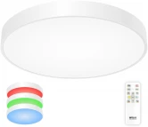 Светодиодный потолочный светильник Citilux Купер CL724105G0 с яркой цветной RGB подсветкой всего плафона. Корпус металлический, круглой формы, цвет белый матовый. Рассеиватель из оптического полимера. Мощность 105Вт, световой поток 8400Лм. С помощью пульта дистанционного управления доступна плавная регулировка яркости от 100 до 10%, управление цветовой температурой доступно в диапазоне от 3000К до 5500К, что позволяет настроить любые оттенки теплого, нейтрального или холодного света. Цветная RGB подсветка имеет различные режимы работы. Таймер - функция отсроченного на 20сек. выключения. Четыре кнопки памяти позволяют сохранить настроенные режимы работы и включать их пультом или обычным настенным выключателем. Подходит для всех типов потолков, в том числе натяжных. Тип крепления – через основание. Изделие комплектуется инфракрасным пультом ДУ.