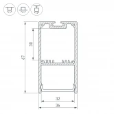 Алюминиевый анодированный профиль для светодиодных лент и линеек. Габаритные размеры (L×W×H): 3000x36x67 мм. Ширина площадки для ленты 32 мм. Отсек для БП 30х32мм. Экраны, заглушки и другие аксессуары приобретаются отдельно. Цена за 1 метр.