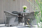 Кресло из искусственного ротанга «Равенна» обладает крепким алюминиевым каркасом, который вручную обвит круглым ротангом графитового оттенка. Сиденье располагает комплектной подушкой из 100% полиэстера, пропитанного специальным влагоотталкивающим составом. Габариты: 570×680×810 мм.