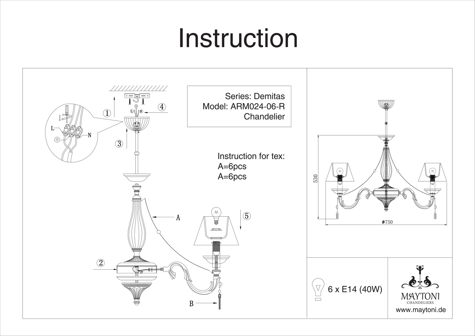 Люстра подвесная RC024-PL-06-R из серии Demitas от компании Maytoni устанавливается на металлический крюк. Классическая люстра прекрасно подойдет в качестве источника основного света для гостиной, спальни, кабинета, оформленных в стиле арт-деко. Основной цвет модели - золото, материал арматуры - металл. Люстра имеет 6 абажуров со свечением вверх, материал изготовления - . Модель оснащена цоколем E14 (6xE14), имеет 6 лампочек с общей мощностью 240W и напряжением 220V. Светильник поддерживает подключение диммера. Габариты: высота - 750 мм, диаметр - 750 мм. Лампочки в комплект не входят. Лучшая цена и условия доставки на Maytoni RC024-PL-06-R в интернет-магазине Fedomo.ru.