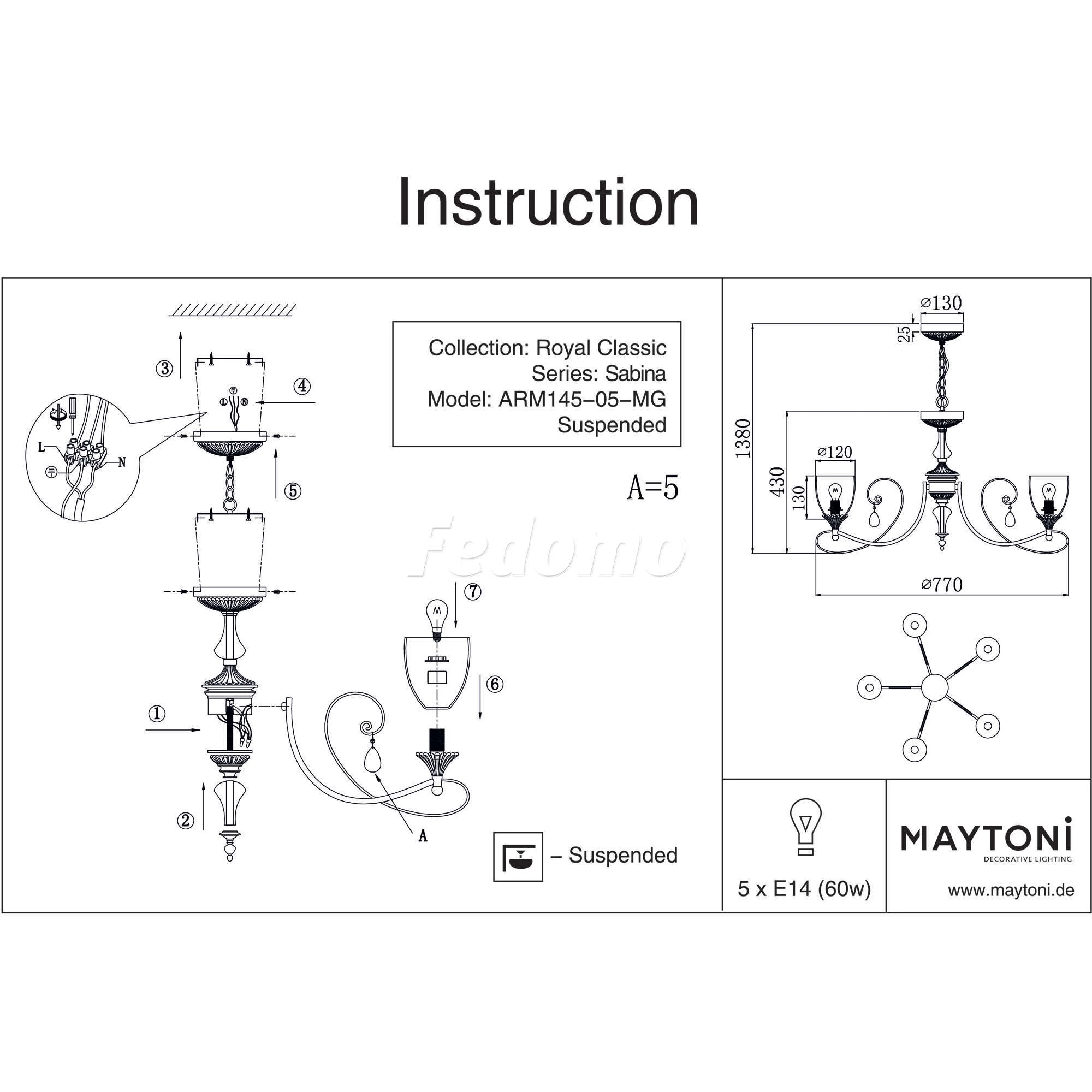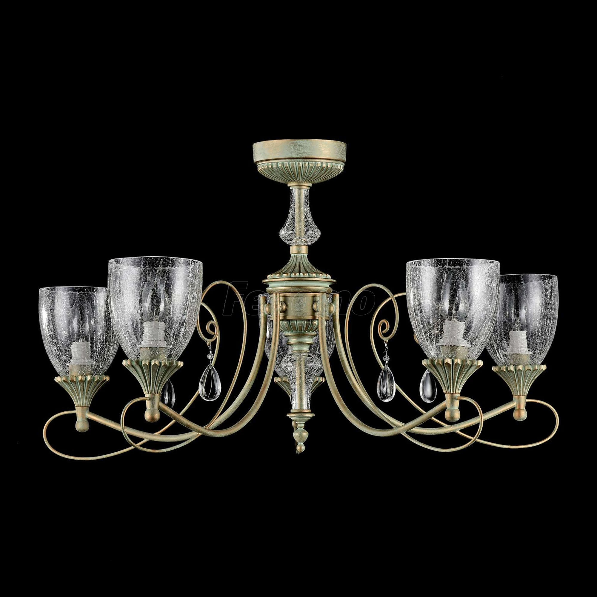 Люстра потолочная кованая RC145-PL-05-MG из серии Sabina от компании Maytoni устанавливается на монтажную пластину. Классическая люстра прекрасно подойдет в качестве источника основного света для гостиной, прихожей и коридора, кафе, кабинета, оформленных в стиле ар нуво. Основной цвет модели - золото, материал арматуры - металл. Люстра имеет 5 плафонов со свечением вверх, материал изготовления - прозрачное стекло. Модель оснащена цоколем E14 (5xE14), имеет 5 лампочек с общей мощностью 300W и напряжением 220V. Светильник поддерживает подключение диммера. Габариты: высота - 1350 мм, диаметр - 770 мм, длина подвеса - 950 мм. Лампочки в комплект не входят. Лучшая цена и условия доставки на Maytoni RC145-PL-05-MG в интернет-магазине Fedomo.ru.
