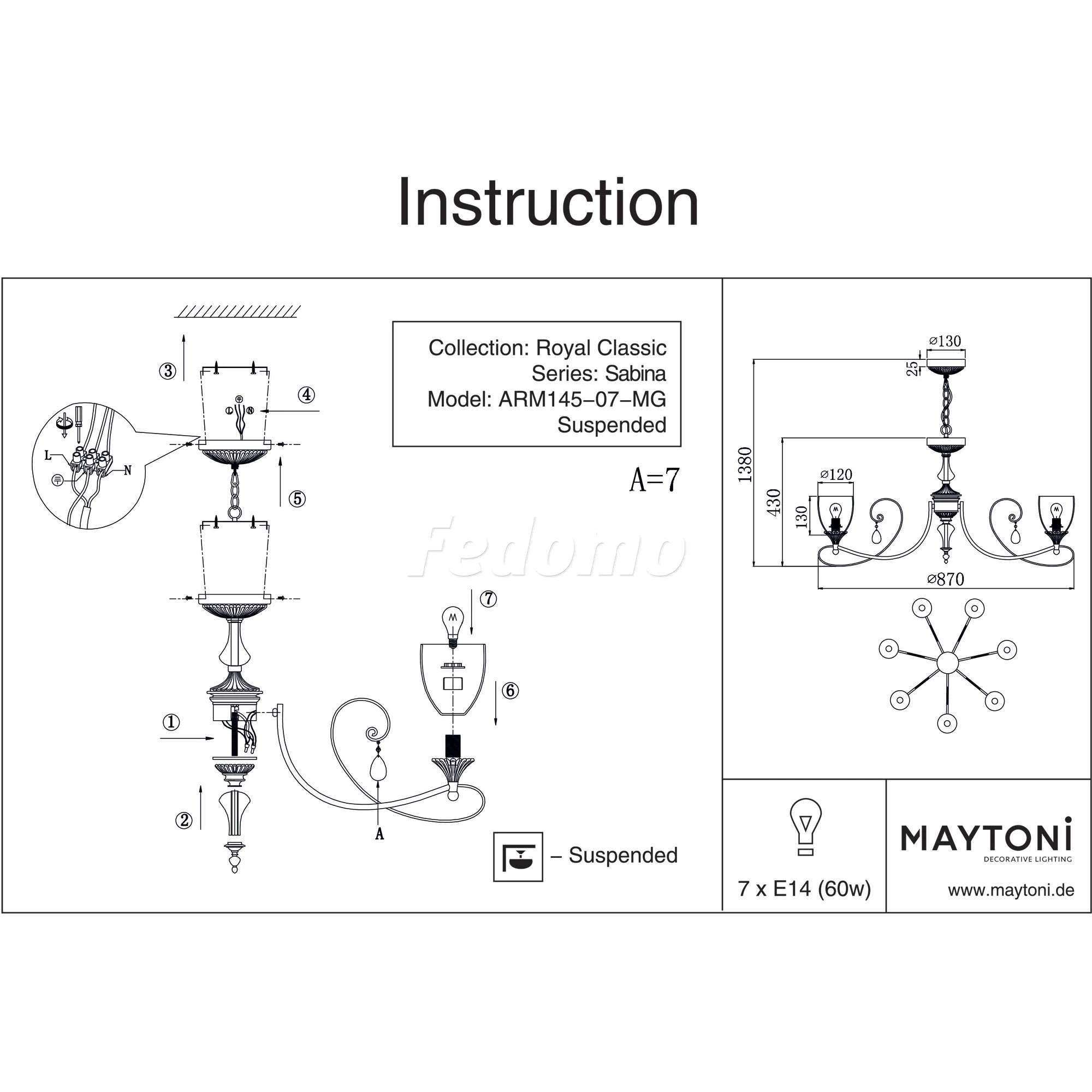 Люстра подвесная кованая RC145-PL-07-MG из серии Sabina от компании Maytoni устанавливается на монтажную пластину. Классическая люстра прекрасно подойдет в качестве источника основного света для гостиной, прихожей и коридора, кафе, кабинета, оформленных в стиле ар нуво. Основной цвет модели - золото, материал арматуры - металл. Люстра имеет 7 плафонов со свечением вверх, материал изготовления - прозрачное стекло. Модель оснащена цоколем E14 (7xE14), имеет 7 лампочек с общей мощностью 420W и напряжением 220V. Светильник поддерживает подключение диммера. Габариты: высота - 1350 мм, диаметр - 870 мм, длина подвеса - 950 мм. Лампочки в комплект не входят. Лучшая цена и условия доставки на Maytoni RC145-PL-07-MG в интернет-магазине Fedomo.ru.