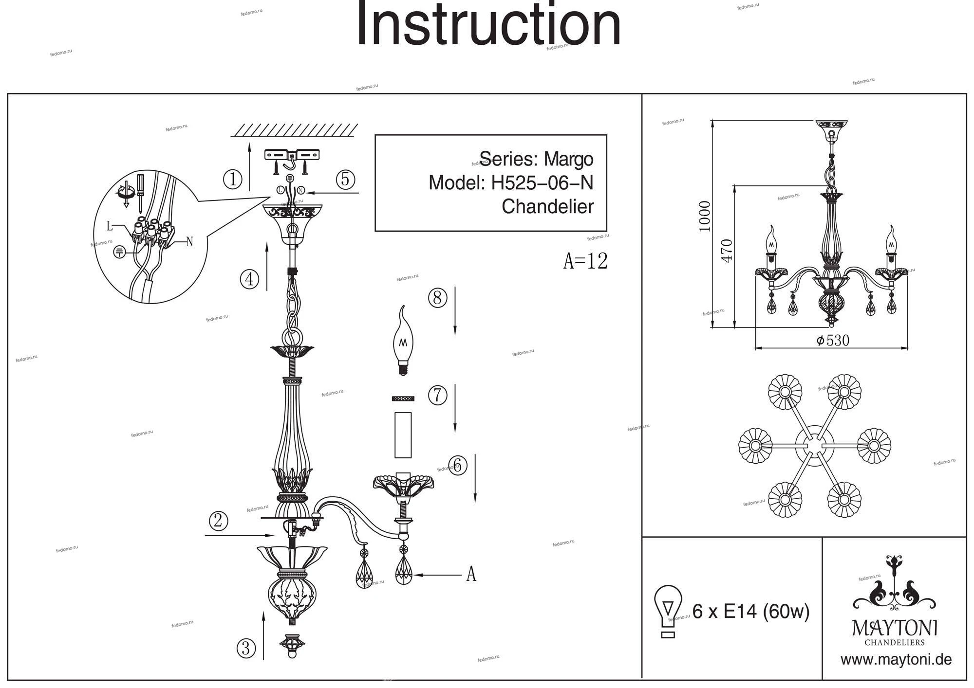 Конструкция подвесной люстры позволяет регулировать высоту изменением длины цепи. Полностью укоротив цепь светильник будет закреплен максимально близко к потолку и внешне будет похож на потолочный. Устаревший артикул: H525-06-N