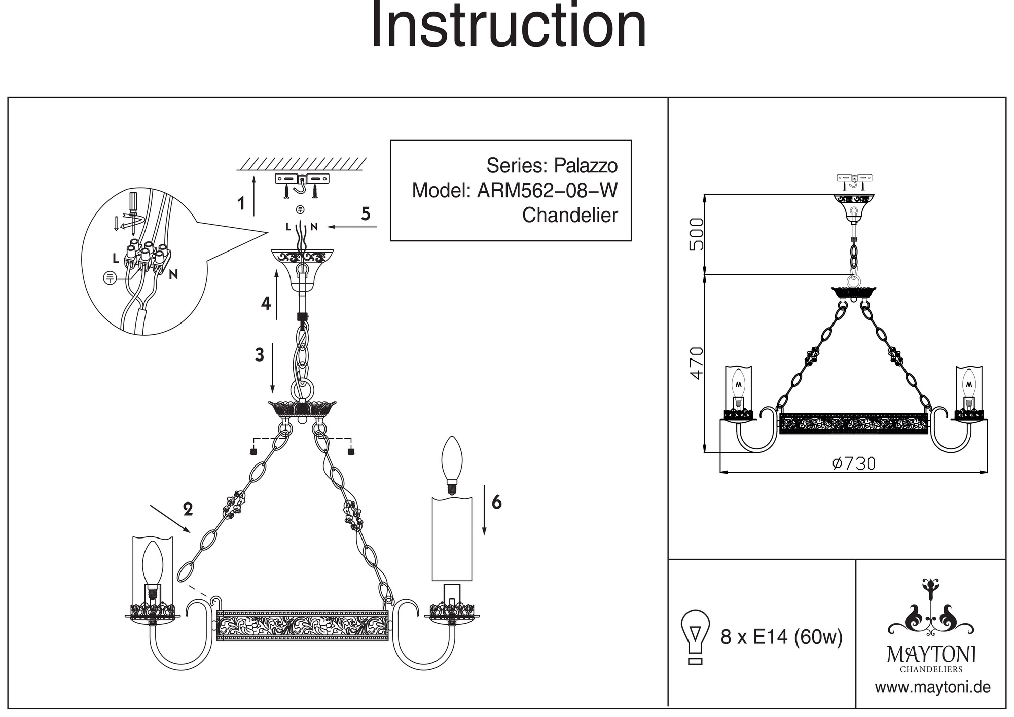 Люстра подвесная RC562-PL-08-W из серии Classic 12 от компании Maytoni устанавливается на металлический крюк. Классическая люстра в виде подсвечника прекрасно подойдет в качестве источника основного света для гостиной, спальни, кухни, кабинета, оформленных в стиле замковый. Основной цвет модели - белый, материал арматуры - металл. Люстра имеет 8 плафонов со свечением вверх, материал изготовления - стекло. Модель оснащена цоколем E14 (8xE14), имеет 8 лампочек с общей мощностью 480W и напряжением 220V. Светильник поддерживает подключение диммера. Габариты: высота - 470 мм, диаметр - 730 мм. Лампочки в комплект не входят. Лучшая цена и условия доставки на Maytoni RC562-PL-08-W в интернет-магазине Fedomo.ru.