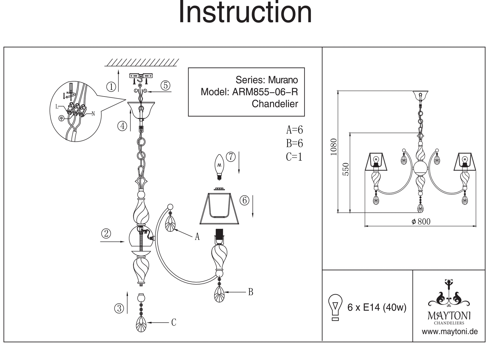 Отличная люстра! Классический дизайн Murano и материал арматуры из металла создают изысканный образ. Подходит для оформления гостиной, спальни или кабинета. Яркий свет из 6 лампочек приятно освещает комнату. Можно подключить диммер, что удобно для настройки яркости. Габариты хорошие, легко устанавливается на металлический крюк. Советую к покупке!