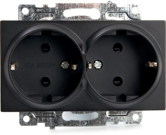 Розетка STEKKER GLS16-7114-05 на 2 гнезда, с заземлением. Материал: поликарбонат, латунь, цвет черный, размер 91*73*43мм. Номинальное напряжение 250, номинальный ток 16А, диапазон рабочих температур 0..+35°C, IP20