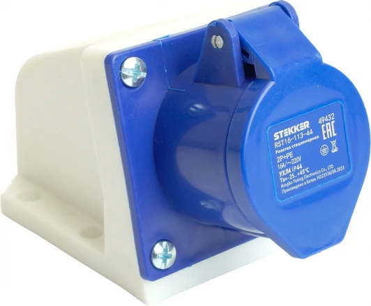 Розетка STEKKER RST16-113-44 на 1 гнездо, с крышкой, -. Материал: PP, цвет синий, размер 135*71*92мм. Номинальное напряжение 220, номинальный ток 16А, диапазон рабочих температур -25°C - +45°C, 44