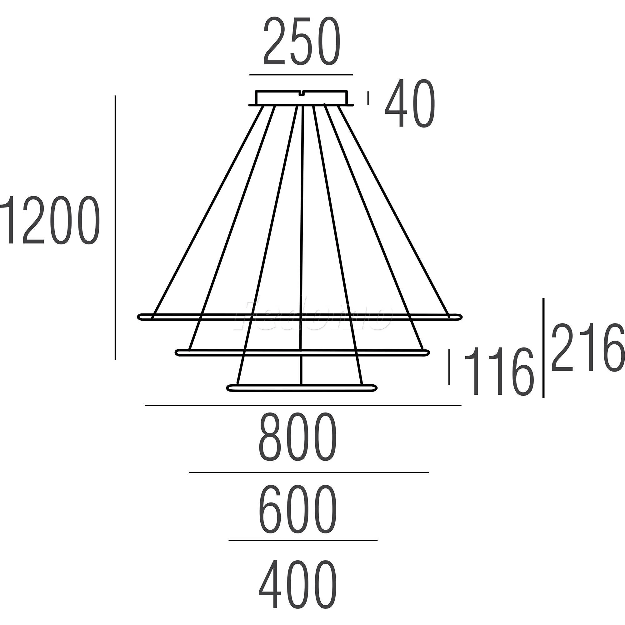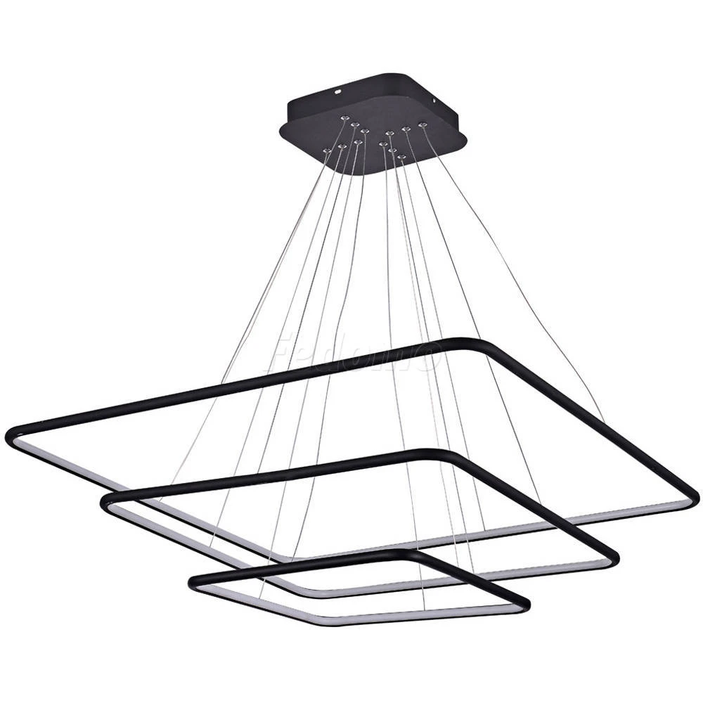 Лампа подвесной люстры расположена на внутренней стороне плафона. У люстры 3 плафона с различными размерами: 800x800мм, 600x600мм, 400x400мм.