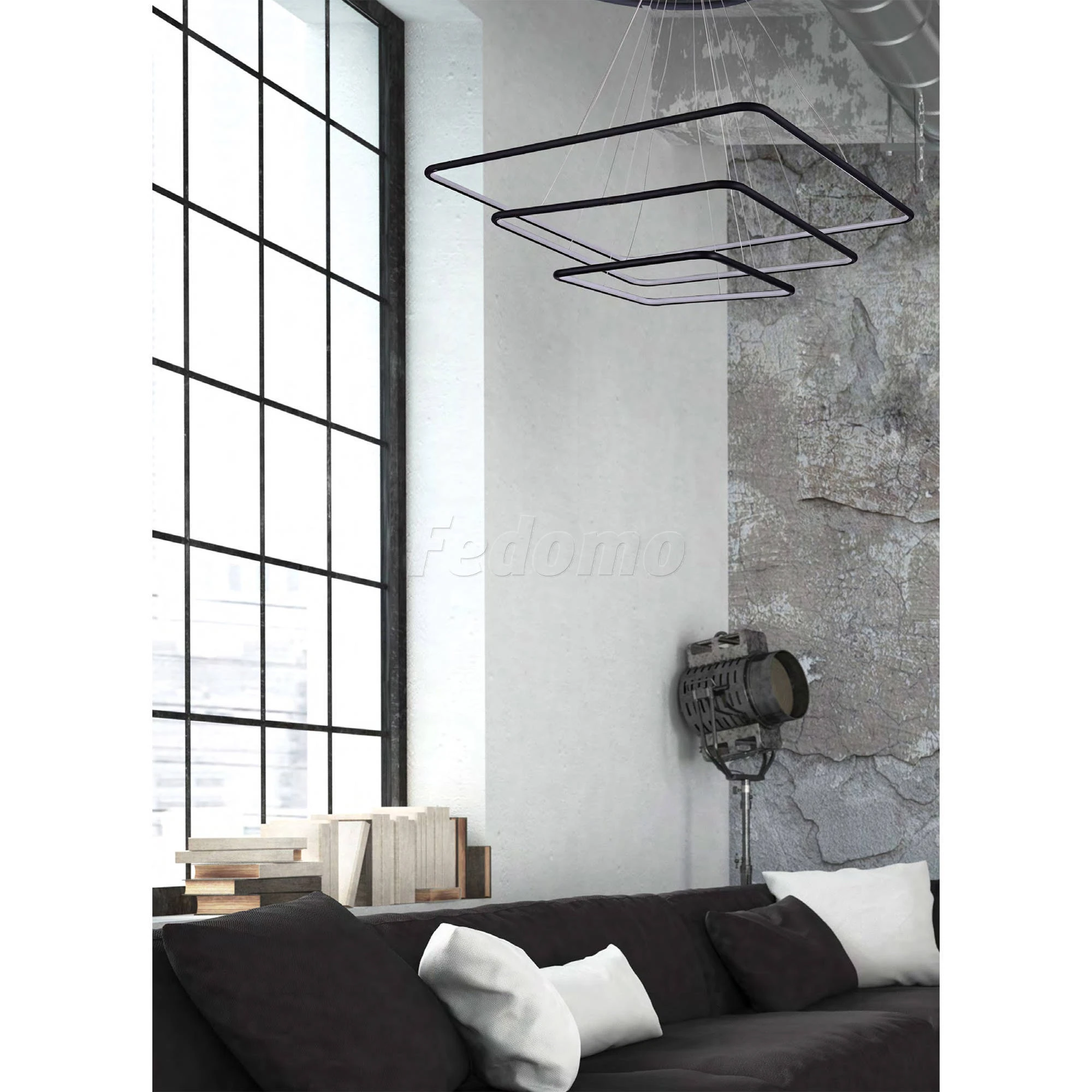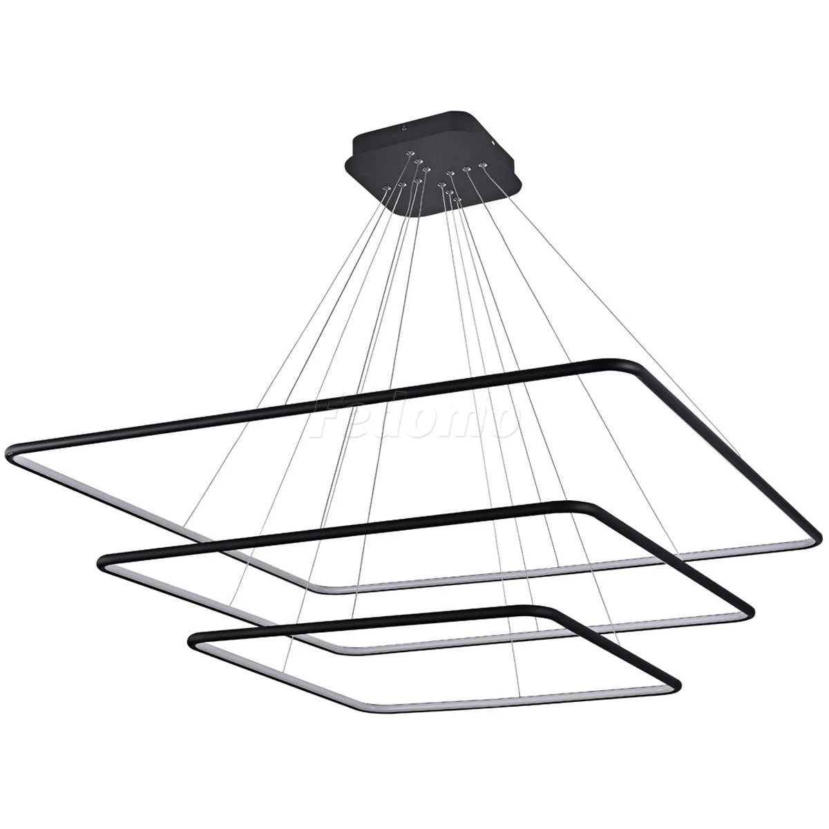 Лампа подвесной люстры расположена на внутренней стороне плафона. У люстры 3 плафона с различными размерами: 1000x1000мм, 800x800мм, 600x600мм.