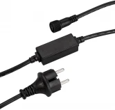 Шнур питания для светодиодных гирлянд с эффектом мерцания. Материал оболочки ПВХ. Цвет провода чёрный. В комплект входит: шнур питания с вилкой европейского стандарта (IP44), 2pin разъём подключения к гирлянде, выпрямитель AC/DC (1.6A). Длина провода 1.5 метра.