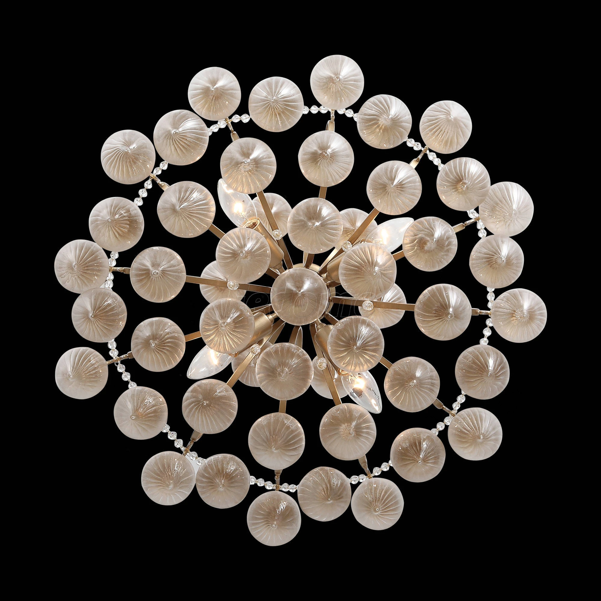 Люстра коллекции Frutti создана для современных интерьеров, выдержанных в легкой светлой цветовой гамме и оформленных в стиле модерн, арт- деко или эклектика. Металлическое основание этой люстры окрашено в цвет шампань или золото, а гирлянды невесомых на