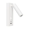 Накладной настенный светильник. Мощность 3 Вт, св. поток 200 лм, 65 лм/Вт, теплый 3000 K, CRI>80, угол 20°, напряжение питания 230 В. Белый прямоугольный корпус из алюминия, степень защиты IP20. Размер основания 60х180х25 мм. Размер светоизлучателя Ø30×110 мм. Монтаж накладной. Драйвер встроенный, пульсация <5%. Встроенный USB порт для зарядки (стандартный и Type-C).