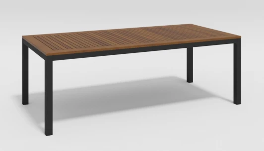 Материалы: всесезонный алюминий, тик. Цвет: каркас - темно-серый / столешница - тик. Комплектация и габариты: Габариты Д 220 * Ш 100 * В 75. Особенности: столешница выполнена из тиковых планок.