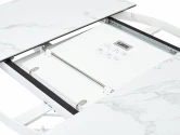 Описание модели: простая система раскладывания, вставка-бабочка, выполненная из МДФ в белом цвете, позволяет увеличить длину столешницы до 170 с; керамика на стекле, глянец, толщина столешницы 13,5 мм (5,5 мм керамика + 8 мм стекло), не царапается, не впитывает загрязнения, термостойкая; основание стола - металл, цвет – белый. Упакован в 2 коробки.