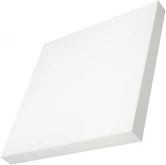 Накладной светильник. Мощность 60 Вт, св. поток 4900-5500 лм, 80-90 лм/Вт, теплый 3000 K, CRI>90, угол 120°, напряжение питания 230 В. Белый квадратный корпус из алюминия, экран PC, степень защиты IP40. Размер: длина 600 мм, ширина 600 мм, высота 64 мм. Монтаж накладной. Драйвер 27-40 В, 1400 мА, пульсация <5%.