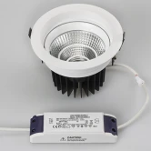 Встраиваемый светильник LTD-140WH 25W White 30deg мощностью 25 Вт с дневным белым цветом свечения (5000 К). Особая конфигурация корпуса позволяет эффективно отводить тепло, обеспечивая безопасность и долгий срок службы светодиодов. Индекс цветопередачи CRI>80 обеспечивает точное восприятие цветовых оттенков. У светильника узкий угол излучения 30° и световой поток 2850 лм. Светильник предназначен для освещения жилых, офисных, торговых и других помещений. Компактный драйвер для подключения к сети 230 В поставляется в комплекте. Простая и удобная установка светильника с помощью пружин в монтажное отверстие диаметром Ø128 мм.