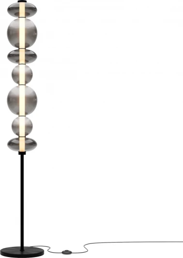 Светильники с тонированными выдувными стеклянными плафонами (дымчатыми или янтарными) и металлической арматурой (черной или цвета латуни). Окрашивание плафонов градиентное. Источник света: LED. Световой элемент установлен внутри акрилового рассеивателя. Цветовая температура источника света – 3000К, угол рассеивания — 120°. Торшеры снабжены Push-кнопкой на проводе.