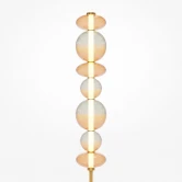 Светильники с тонированными выдувными стеклянными плафонами (дымчатыми или янтарными) и металлической арматурой (черной или цвета латуни). Окрашивание плафонов градиентное. Источник света: LED. Световой элемент установлен внутри акрилового рассеивателя. Цветовая температура источника света – 3000К, угол рассеивания — 120°. Торшеры снабжены Push-кнопкой на проводе.