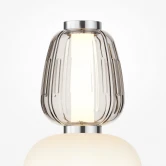 Металлическая арматура, цвет - золото, хром. Микс плафонов округлых и вытянутых форм из белого матового и прозрачного стекла с сетчатым и с линейным повторяющимся рельефным рисунком. Регулируемая высота подвесных моделей, провод - 3 метра. LED-источник света, цветовая температура 3000К.
