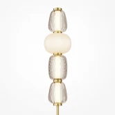 Металлическая арматура, цвет - золото, хром. Микс плафонов округлых и вытянутых форм из белого матового и прозрачного стекла с сетчатым и с линейным повторяющимся рельефным рисунком. Регулируемая высота подвесных моделей, провод - 3 метра. LED-источник света, цветовая температура 3000К.