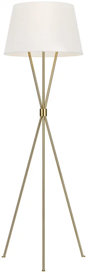 Основа-тренога в стиле середины ХХ века. Удлинённые ножки пересекаются в заданной точке. Абажур «белый лён». Покрытие «полированная латунь», «состаренное железо» и «полированный никель».