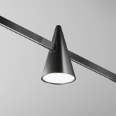 Арматура и плафоны конической формы из алюминия в двух цветах – черном и латунь. Опаловый рассеиватель. Долговечные энергосберегающие источники LED-света бренда Osram. Цветовая температура 3000К, угол рассеивания 120°, коэффициент цветопередачи >90. Крепление магнитами на шинопровод с возможностью легкого перемещения светильников вдоль шины. Функция диммирования в группе возможна только в сочетании с блоками DALI/0~10V.