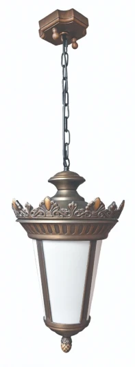Красивая уличная люстра на цепи в великолепном классическом дизайне, сделана из латуни и состарена методом гальваники в цвет "Старая бронза". Предназначенная для подсветки веранд, беседок, входных групп, люстра придаст неповторимый классический стиль вашей усадьбе. А плафон молочного цвета из закаленного антивандального стекла, рассеивает свет от лампы, что позволяет уйти от эффекта ослепления, освещая окружающее пространство, мягким светом.
