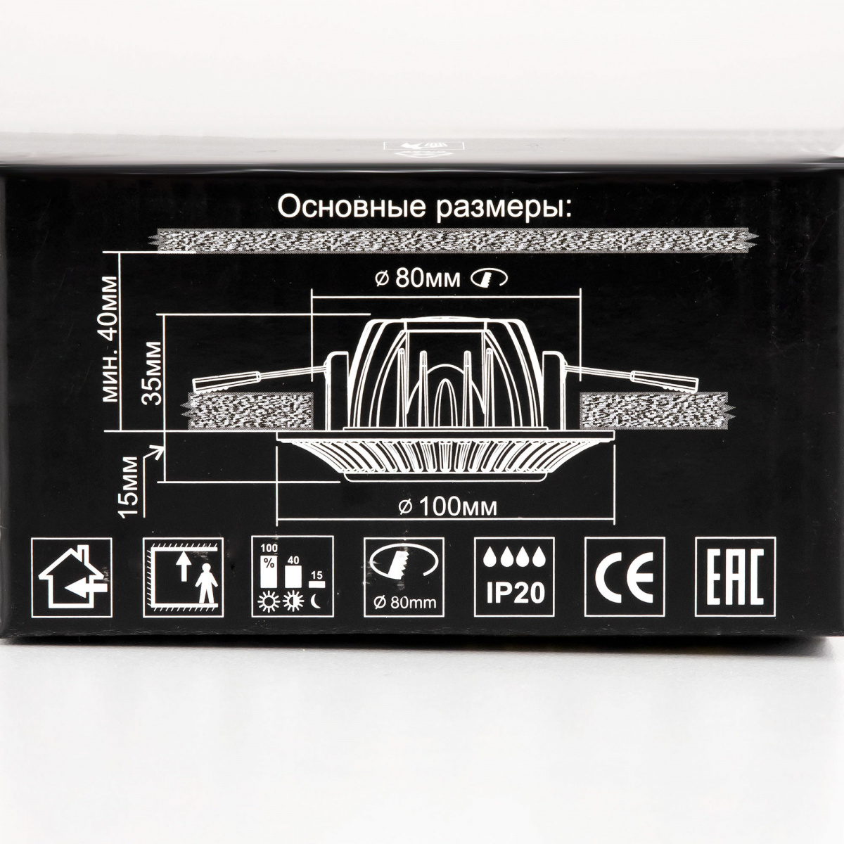 Встраиваемый светодиодный светильник Citilux Дзета CLD042NW0 в классическом стиле. Корпус из прочного полимера, круглой формы, с текстурным рисунком, цвет белый. Изделие оснащено ярким светодиодом с мощным радиатором охлаждения. Мощность 7Вт, цветовая температура 3500К – нейтральный свет. Встроенный ступенчатый диммер 100-40-15% управляется обычным настенным выключателем. Свет безопасный для глаз, без мерцаний и пульсаций во всех режимах работы. Модель подходит для всех типов навесных и натяжных потолков.