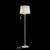 Арматура из металла. Абажур из ПВХ покрыт тканью 2-х цветов. Основание абажура - трапеция. Дополнительный источник света - LED-светильник у основания абажура.